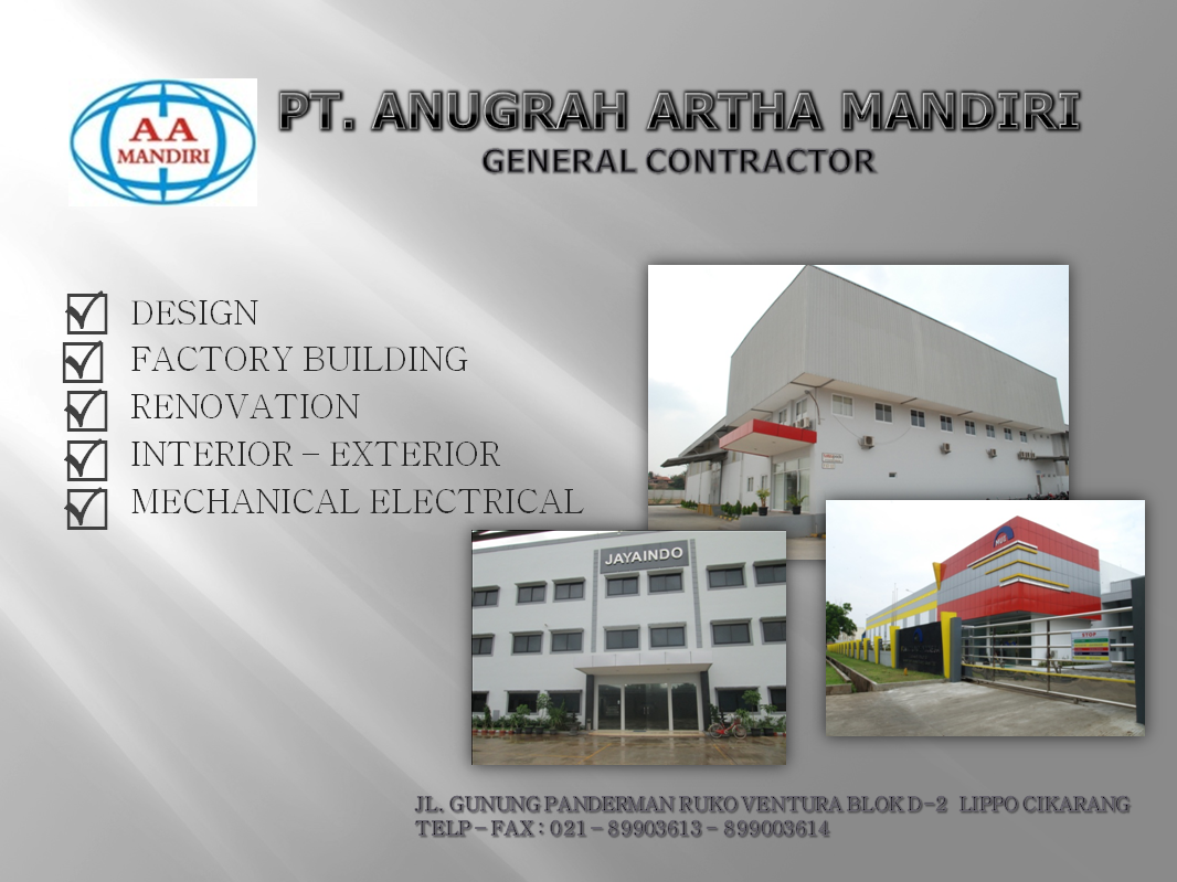 PT. Anugrah Artha MandiriPT. Anugrah Artha Mandiri adalah suatu perusahaan swasta yang bergerak di bidang jasa konstruksi. Bisnis utama kami bergerak di bidang konstruksi yang meliputi pembangunan dan renovasi Gedung, Apartement, Rumah, Pabrik ( Interior & Exterior ) yang semuanya di design dengan sendiri di dukung oleh team yang solid, profesional dan ahli di bidangnya masing-masing.
